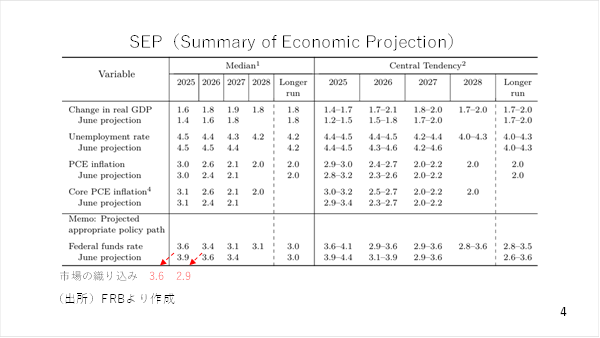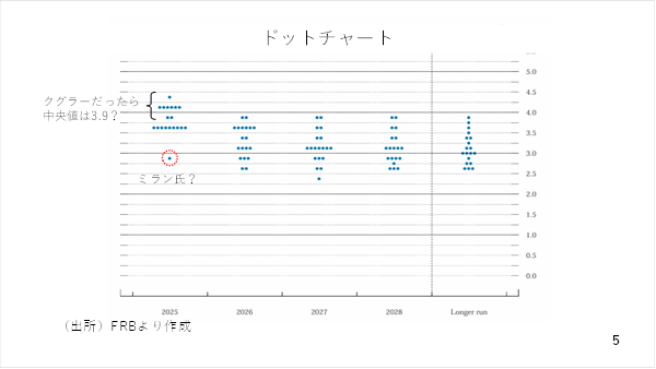 あえて「タラレバ」を言えば、着任したミラン理事の代わりにその前任であるクグラー理事が投票していれば、おそらく中央値は3.6%ではなく、3.9%だった可能性が十分です。いずれにせよ、年内の追加利下げ幅が0.25ポイントに止まるのか0.5ポイントに達するのか、これからの雇用や物価に関する指標次第と言え、市場も振らされる展開となりそうです(スライド 5)。