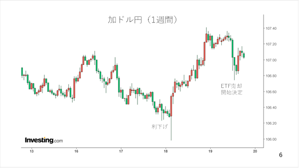 さて、今週はカナダ中銀も0.25ポイントの利下げを決定しましたが、カナダドル円も週初に比べ、カナダドル高円安となりました。ドル円を含め、海外での利下げにも関わらず、円安に振れたのです(スライド 6)。