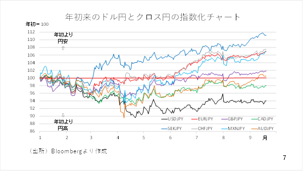 こうした動きは今回のドル円、カナダドル円に限りません。今年は日銀が1月に0.25ポイントの利上げに踏み切った一方、多くの海外中銀が利下げを実施しました。その結果、政策金利差は縮小しましたが、多くの通貨ペアで円安が進行しています。ドル円およびクロス円について、年初を100として指数化したチャートをみると多くの通貨ペアが年初よりも円安です(スライド 7)。