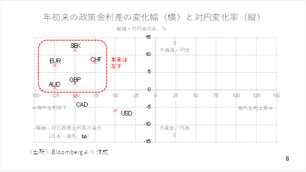 そこで、年初来の日本と海外との政策金利差の変化(日本-海外)を横軸、当該通貨の対円変化率を立て軸にプロットした散布図を作成しました。本来、政策金利差の縮小は対円での下落をもたらすはずですから、左下のマスにデータが集中し、散らばり方も右上方向に並ぶはずです。ところが、実際には左上に集中しています。