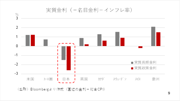 日本の場合、政策金利で見ても長期金利で見てもインフレ率を差し引いた実質金利は他通貨より大幅に低く、水準としてもマイナス圏です。これが根強い円安圧力となって影響している可能性が高いと言えます(スライド 9)。