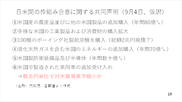 また、円安の一因である貿易赤字も拡大する見通しです。今般、合意に達した日米関税交渉では、対米輸入の拡大が決まりました。その結果、日本の対米貿易黒字も数兆円単位で縮小するとみられます(スライド 10)