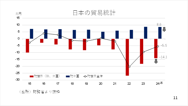 そこで昨年を例に、日本の貿易収支の構造を見ておきましょう。日本はアメリカを除く海外との間で約14.1兆円の貿易赤字でした。但し、約8.6兆円の対米貿易黒字により、全体の貿易赤字は約5.5兆円にとどまりました。