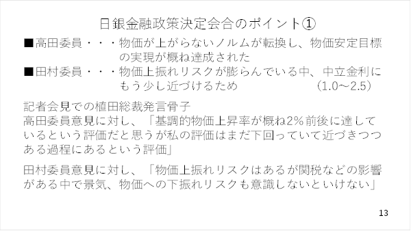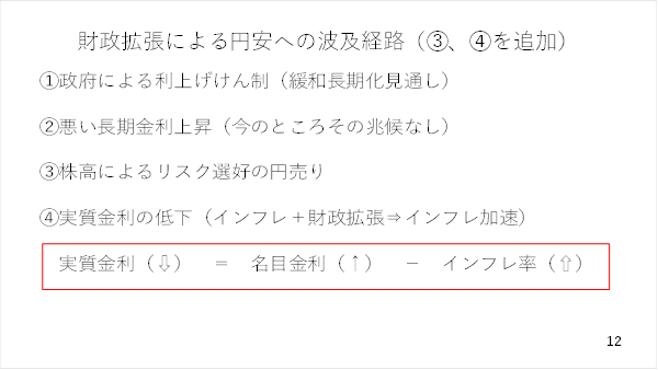 当然、日銀の利上げも早まると思われますが、それ以上にインフレ率が高まると、実質金利が低下し、円安を招くシナリオです(スライド 12)。