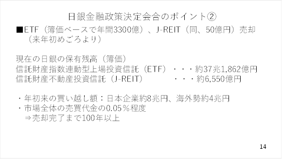 また、株安を招いたETF及びJ-REITの売却開始決定についてもそのペースが極めてゆっくりとしたものであることから徐々に警戒が和らぎ、株式相場も持ち直しに転じました。本日示された売却額であれば、売却を終えるまでに100年以上を要する極めて緩慢なペースです(スライド 14)。