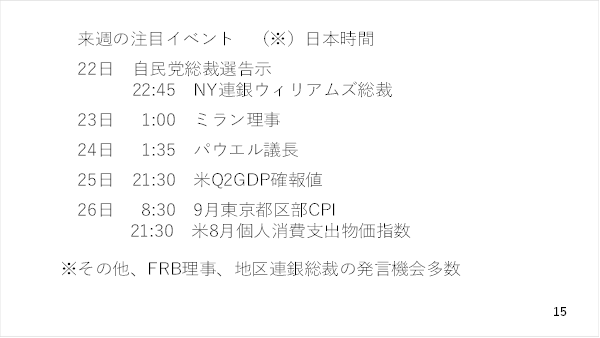 では、来週の注目イベントを見て行きましょう。来週はいよいよ自民党総裁選が告示されます。また多くのFRB理事や地区連銀総裁の発言機会を控えていますが、その中でもパウエル議長の発言に注目です。そのほかでは26日に日米の物価統計を控えています。特にアメリカの年内の追加利下げ幅を占う上で物価統計に注目です(スライド 15)。