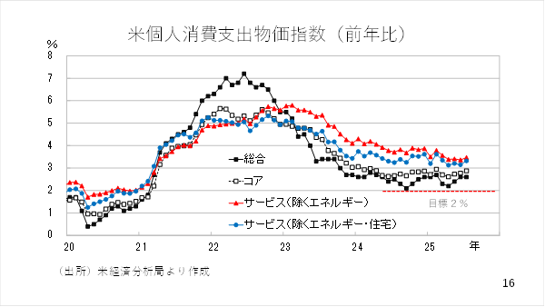 ただ、物価が上がり始めるとインフレ期待が高まり、消費の前倒しを通じて自己実現的に実際のインフレにつながる可能性も否定できません。特に3%台と高い伸びがみられるサービス価格は、関税の影響を直接受けるものでもありません。FRBもインフレに対する警戒を解けずにいるとみられます(スライド 16)。