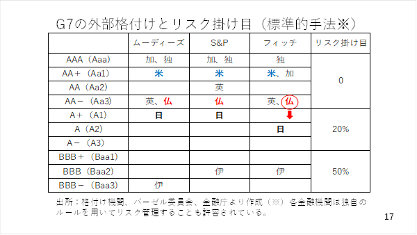 実際にその動画収録後、フィッチがA+への格下げを発表しましたが、これまでのところユーロ相場に影響は出ていません。確かに、まだ格下げを決定した格付け機関が1社にとどまっていること、加えてフランス国債を売却した場合でもその資金でドイツ国債に投資をすれば、為替相場への影響は生じません。ただし、2社目が格下げに踏み切った場合、相場が動揺する可能性もあり、ユーロについては引き続きフランスの格付けに要注意です(スライド 17)。