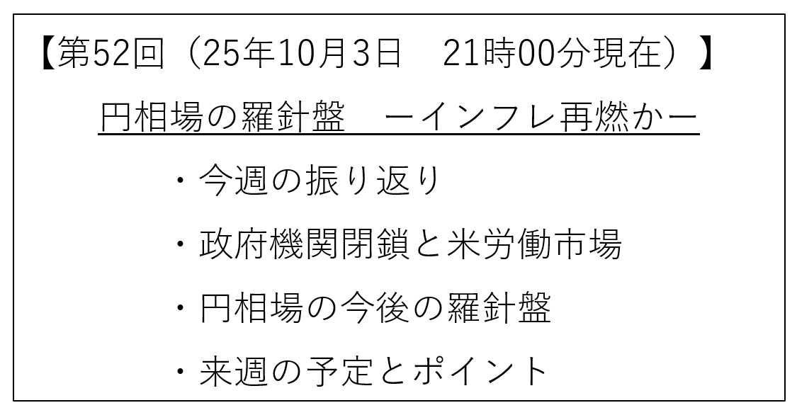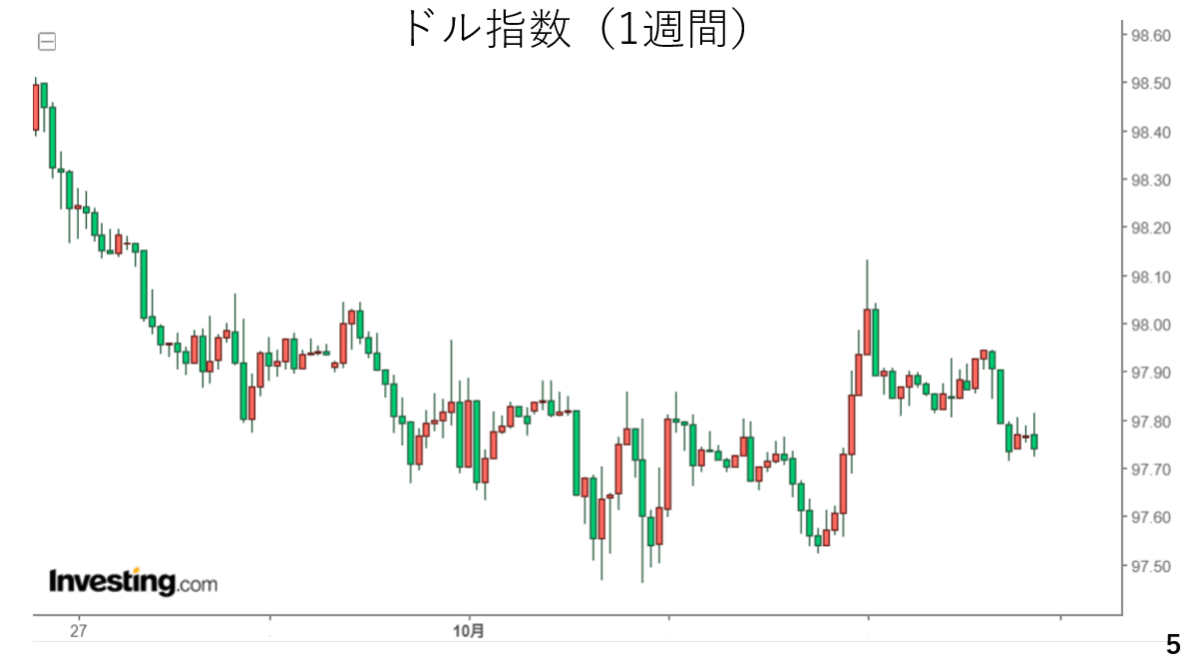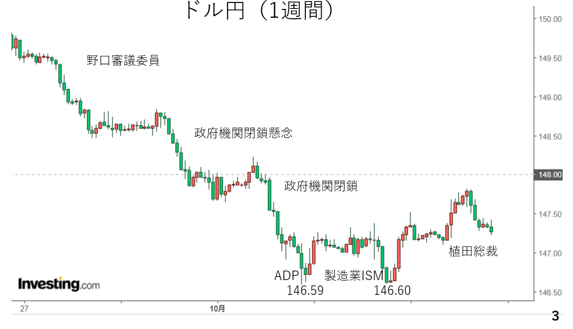 今週のドル円相場は、日銀の利上げ観測台頭による円高と、政府機関の閉鎖、予想を下回ったアメリカの労働関係の経済指標を受けたドル安によって、3円以上も下落しました。ただ、10月3日の植田総裁の講演を受けて利上げ観測が後退し、ドル円は147円台後半まで持ち直しています。(スライド3)
