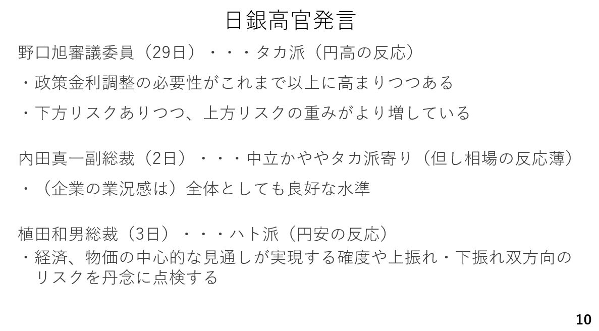 一方、先述の通り、利上げ観測に冷や水を浴びせたのが植田総裁です。経済や物価に関して上振れ、下振れ双方向のリスクを点検すると発言しました。つまり、上振れリスクと同程度の下振れリスクも認識していることになり、利上げ観測の後退と円安、株高を招きました。(スライド10)