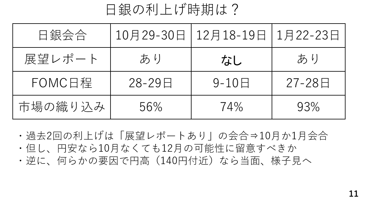 ただ日銀は為替相場を気にしており、年末にかけて仮に何らかの要因によってドル高円安が進む場合、1月会合を待たず、12月に利上げに踏み切る可能性も否定できません。逆に言えば、140円程度まで円高が進んだ場合、日銀は当面様子見姿勢を維持するとみられ、利上げのタイミングは為替相場の動向に強く影響されると言えます。(スライド11)