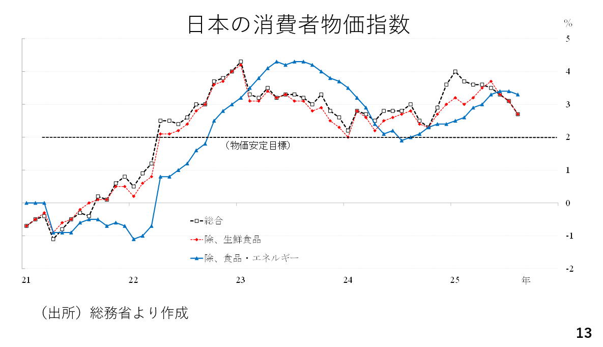 実際、2023年の半ば以降、インフレ率が低下しましたが、その後の円安再燃により、インフレ率も反転しました。また、食品とエネルギーを除いたベースのいわゆるコアコアの伸びが高い点も気掛かりです。本来であれば輸入インフレの影響を受けにくい為です。輸入インフレが経済全体へと波及しつつある可能性があります。(スライド13)