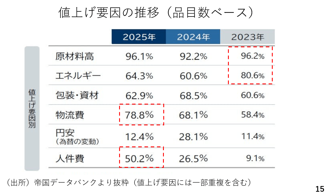 値上げの要因を見ると2023年は原材料高やエネルギー価格の上昇であり、まさに輸入インフレが値上げの主因でした。一方、2025年は人件費が目立ちます。日本のインフレは輸入インフレを起点に裾野の広がりを見せつつあり、消費者物価指数の中のコア・コアの伸びが最も高い点とも整合的です。(スライド15)