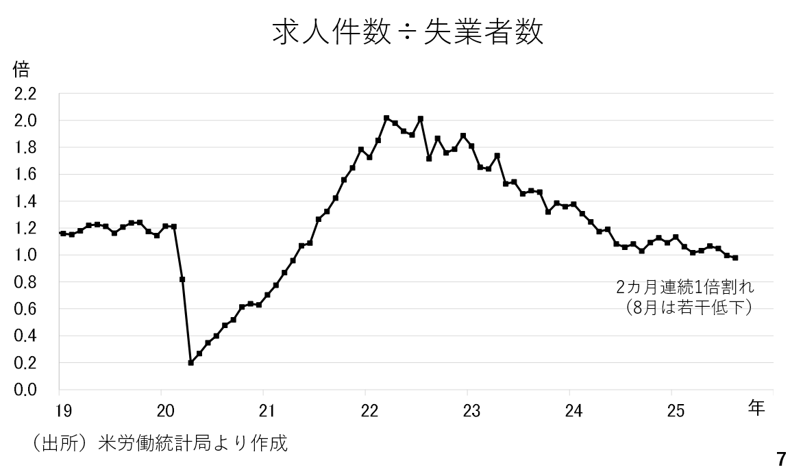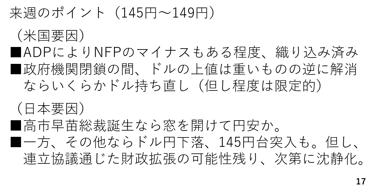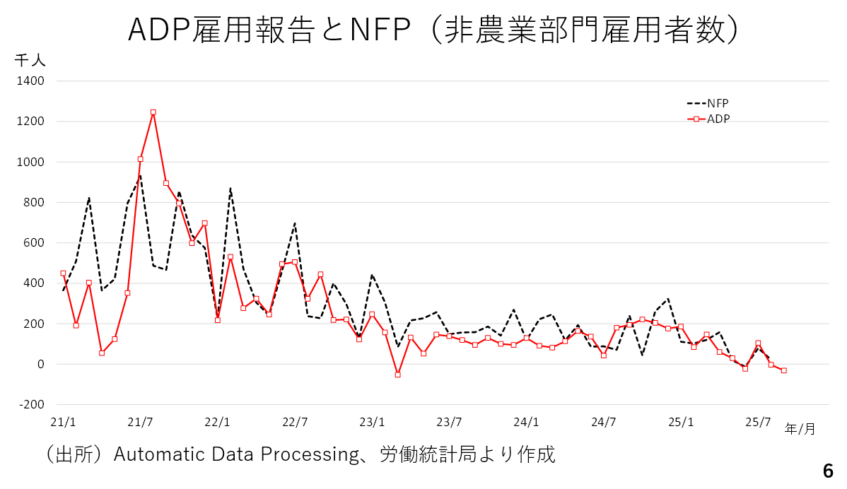 今週は民間(ADP)の雇用統計が8月に続いてマイナスを記録しました。政府機関の閉鎖により、本日予定されていた雇用統計の発表が延期されましたが、このADPと雇用統計の非農業部門雇用者数(NFP)はある程度連動しており、9月のNFPもマイナスとなっている可能性があります。ただ、ADPがマイナスとなったことで、市場がNFPのマイナスに心構えが出来た面もありそうです。(スライド6)