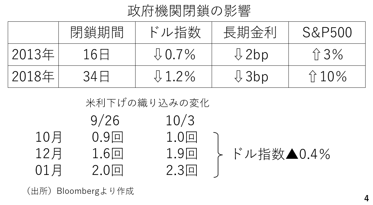 もっとも、先週の段階でも1回よりは2回の利下げが意識されていたことから、相場への影響は限定的でした。結局、悪材料が目立った割に、ドル指数の下げ幅は0.4%程度にとどまっています。(スライド5)