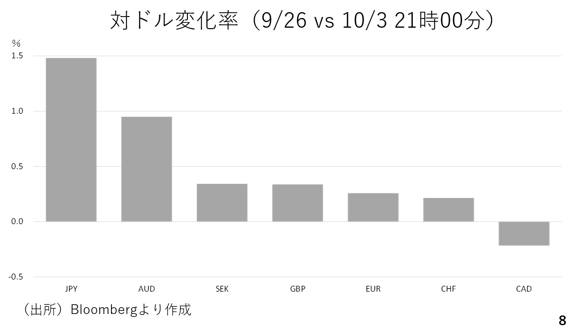 今週の主要通貨の対ドル変化率を見ますと、多くの通貨が対ドルで上昇しており、ドルが冴えなかったことがわかります。但し、日本円や豪ドルを除けば、対ドル上昇率は限定的です。この為、今週3円以上もドル円が下落したのは、ドル安よりも円高であったと考えられます。(スライド8)