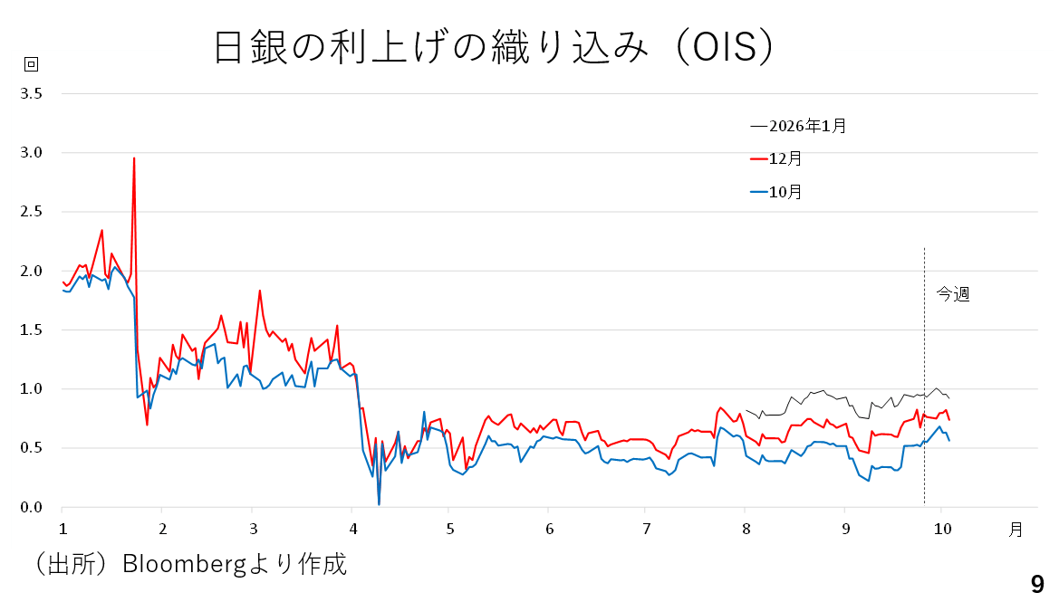 今週の円高の背景は日銀による利上げの織り込みが高まったことです。野口審議委員の講演を受け、OIS市場では10月利上げの織り込みが一時6割台半ばまで高まりました。一方、本日の植田総裁の発言を受けて5割台まで利上げの織り込みが後退し、円安につながりました。(スライド9)