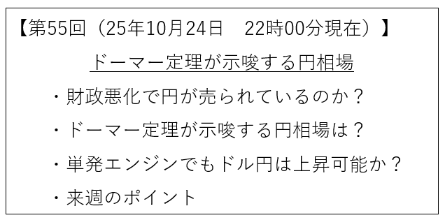 当シリーズでは、高千穂大学の商学部教授で三菱UFJ銀行の外国為替のチーフアナリストを務めた内田稔氏に、為替を中心に金融市場の見通しや注目のニュースをウィークリーで解説してもらう。※この記事は10月25日に配信された「内田稔教授のマーケットトーク第55回マーケットトーク ドーマー定理が示唆する円相場」を再編集しています。ご質問はYoutubeチャンネルのコメント欄からお願い致します。また、チャンネル登録もお願い致します。