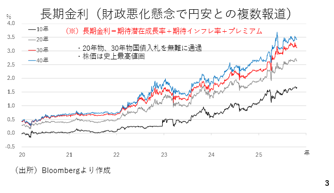 では、長期金利はなぜ上昇しているのか。長期金利の構成要素は期待潜在成長率と期待インフレ率およびプレミアムです。この内、プレミアムが拡大して長期金利が上昇することを悪い金利上昇と呼びます(スライド3)。