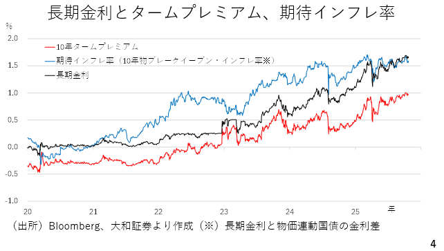 昨年来、日銀は国債の買い入れ額を徐々に減じる量の正常化にも着手しています。足元のタームプレミアムの拡大は、政府の財政悪化を懸念したものではなく、日銀の国債保有残高の減少を反映した動きと考えられます。
