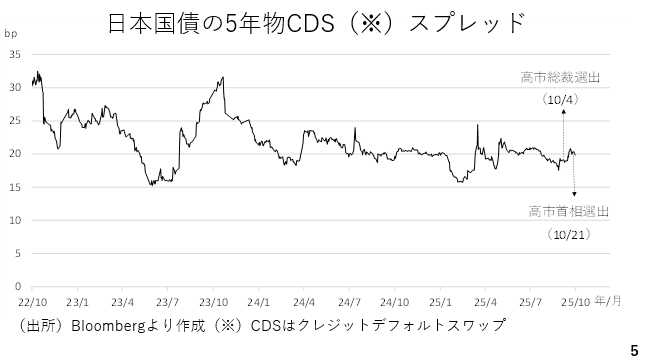 一方、政府の財政に対する懸念を表すクレジットデフォルトスワップ市場のスプレッドは横ばい圏で推移しています。やはり、悪い金利上昇とは言えない状況です(スライド5)。