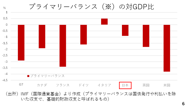 また、プライマリーバランス(基礎的財政収支)をみても、G7の中で黒字であるイタリアを除き、対GDP比で見たて赤字は日本が最も低くなっています。今後の財政出動や赤字国債の発行には注視を要するものの、少なくとも現時点においては、悪い金利上昇との見方は妥当ではありません(スライド6)。