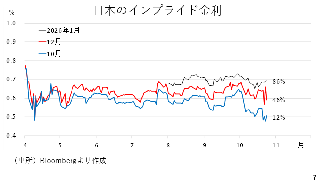 ではなぜ円安が進んでいるのでしょうか。その一因は日銀の利上げ観測の後退でしょう。来週の日銀金融政策決定会合における利上げの織り込み度合いは1割程度まで低下しました。現在の円安の根底にあるのは、日本のインフレの定着と実質金利の低下を見越したものと考えられます。それが株式相場の上昇、すなわちリスク選好の円売りや市場の一部で残っている円ロングの解消に伴う円売りなどと相まって、強力な円安圧力になっていると考えられます(スライド7)。