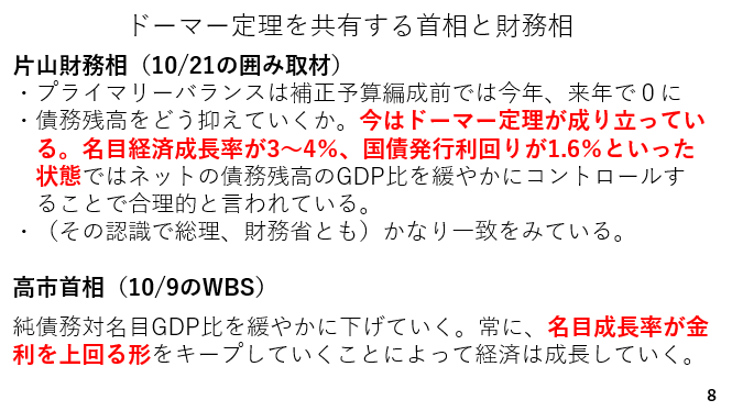 また、10月9日に経済番組に出演した高市首相も、ドーマー定理という名前こそ出しませんでしたが、やはり金利を上回る名目成長率を維持する重要性に言及しています(スライド8)。