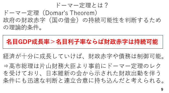 高市首相が社会保険料の引き下げや教育の無償化、副首都構想といった財政支出を伴う政策を条件として提示してきた日本維新の会と迅速に協議した上で、連立政権発足に持ち込むことができたのはその為でしょう。従って、首相と財務相の間でこのドーマー定理が共有されているものと考えられます(スライド9)。