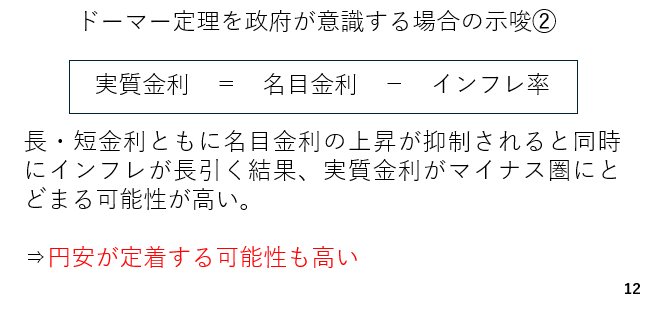 長・短の名目金利の上昇が抑制され、インフレが長引く場合、日本の実質金利はマイナス圏にとどまると考えられます。長引く円安の主因はマイナス圏にある実質金利です。したがってドーマー定理は、円安定着の可能性を示唆していると言えます。(スライド12)