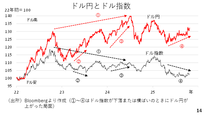 他にも➁~④の数字を付記している期間は、どれもドル指数が下落または小幅な上昇であってもドル円が勢いよく上昇している場面です。ドル円は強い円安材料があればドルそのものの上昇がなくても上がり得るのです。(スライド14)