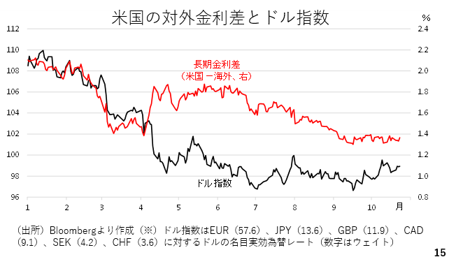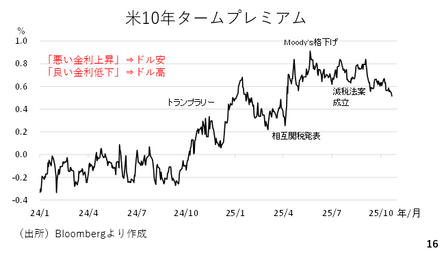 反対に足元ではタームプレミアムが縮小して長期金利が4%を割り込んでいますから、いわば米国債が買われる良い金利低下と見ることもできます。長期金利の低下がドルに対してポジティブに作用する可能性もあるでしょう。(スライド16)