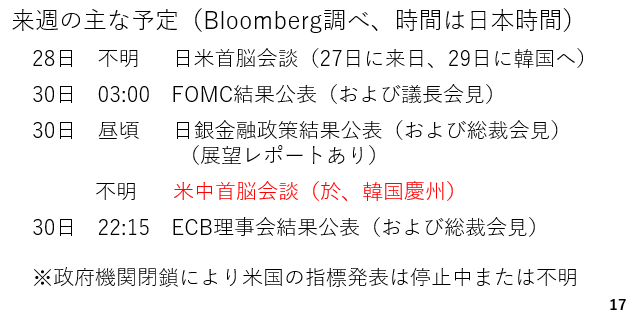 では来週の予定です。アメリカの政府機関閉鎖が続いており、経済指標の発表は引き続き未定です。一方、来週は日米や米中首脳会談に加え、中銀ウィークです。