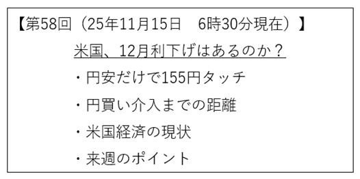 今回は「米国、12月利下げはあるのか?」について解説します。また、円買い介入までの距離間のほか、各地区連銀のデータから米経済について概観します。
