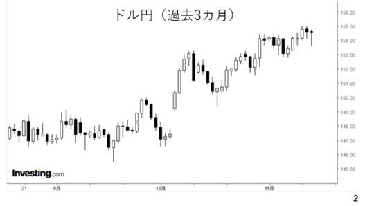 はじめに直近3カ月間のドル円相場です。自民党総裁選後、総じてドル高円安が進み、今週ついに9カ月ぶりの高値となる155円台を回復しました。但し、高値警戒感も強く定着するには至っていません(スライド2)。