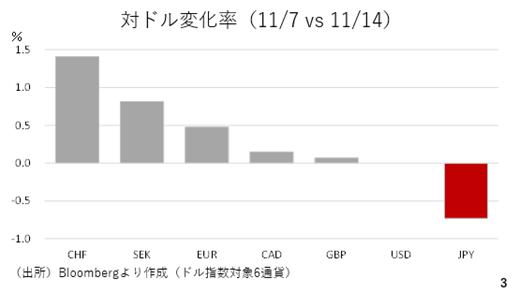 次に、主要通貨の今週の対ドル変化率を見ると円が独歩安でした。ただ、アメリカドルも円とポンドに次いで弱かったことがわかります。従って、今週のドル円の155円台回復は専ら円安によるものだったことになります(スライド3)。