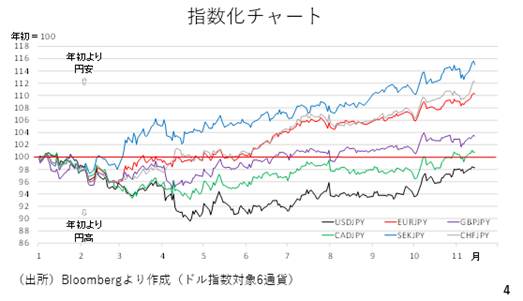 年初来の動きを指数化してみると、今週はスウェーデンクローナ円やカナダ円が年初来高値を更新し、スイスフラン円やユーロ円は史上最高値を更新しました。また、ドル円も年初の水準まであと2%程度まで浮上してきました(スライド4)。