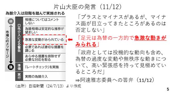 こうした中、片山財務大臣の円安牽制発言のトーンが少し強まりました。昨年7月に日本経済新聞社がまとめた実弾介入までの口先介入の段階に照らしてみると、今週は大臣が「急激な動きがみられる」と発言しており、中盤程度までトーンが強くなったことがわかります。ただ、逆に言えばまだその程度にとどまっており、為替介入が差し迫っている状況ではありません(スライド5)。