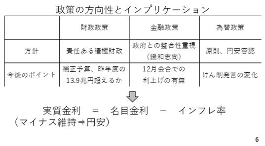 そもそも政府は財政拡張と金融緩和によって名目GDPの拡大を狙っています。これに伴い、一定のインフレが続く中、総じて金利は低位に抑えられる可能性が高い状況です。以前、ドーマー定理とともに説明した内容です。従って、名目金利からインフレ率を引いた実質金利は政策金利、長期金利ともにマイナス圏にとどまると考えられます。かねてより指摘している通り、円安の最大の要因はこのマイナス圏にとどまっている実質金利です。従って、政府はある程度の円安は容認すると考えられます。今後、責任ある積極財政については昨年度の補正予算である約13.9兆円を超えてくるのかどうかに注目です。これまでの報道によればおそらく上回ってくるでしょう。次に、12月会合での利上げの有無です。利上げがなければ、円安が勢いづいて年末年始を迎えると考えられます。そして為替政策については円安けん制発言のトーンの変化に注目です(スライド6)。