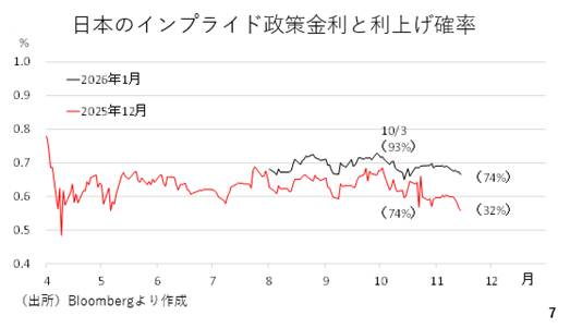 日本の利上げの織り込みについてみておきましょう。現在、市場では12月の利上げは32%しか織り込まれていません。それだけに仮に利上げがあれば、かなりのサプライズとなりますし、そこに円買い介入を被せれば相応のインパクトが見込まれます。もっとも、政策の方向性とマイナス圏の実質金利に照らせば、トレンドが円高方向に変化するとは考えにくい状況です(スライド7)。