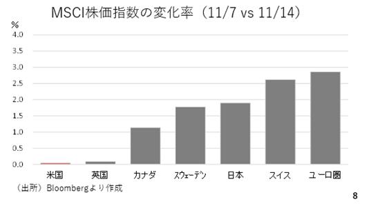 今週、ドルが冴えなかった要因に軟調な米国株のパフォーマンスが挙げられます。MSCIの株価指数について各国地域の今週のパフォーマンスを比べるとアメリカ株が最も冴えませんでした(スライド8)。
