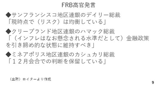 こうした株価の動きを招いたのが、FRB高官らによる12月利下げに対する懐疑的な見方です(スライド9)。