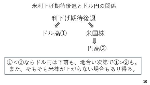 ここで、利下げ期待が後退した場合のドル円への影響を整理しておきましょう。利下げ期待の後退は米金利の上昇を通じてドル高に作用すると考えられます。一方、利下げ期待が後退し、これが株安にすると波及す円の買い戻しを誘発すると考えられます。現在、投機筋のポジションのデータは9月23日時点で止まっていますがおそらく市場は円ショートと思われます。従って、ドル高を円高が勝ればドル円は下落すると考えられます。もっとも、利下げ期待が後退する状況は裏を返せば米経済が好調であるということでもあります。従って、地合いによっては利下げ期待が後退しても米国株が下がらないケースも充分に考えられます。その場合の利下げ期待の後退はドル高を通じてドル円にも上昇圧力となりそうです。