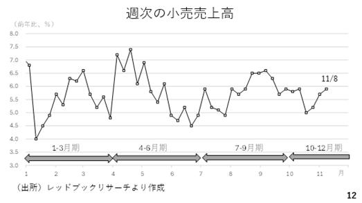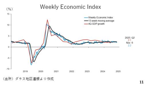 では次に、米経済を見ておきましょう。政府機関閉鎖により、経済指標の発表が滞っていますが各地区連銀がさまざまな指標を発表しており、そこから米国経済を垣間見ることができます。はじめに景況感について、これまでにもご紹介しているダラス地区連銀のウィークリーエコノミックインデックスです。これは10種類の週次や日次データから現在の米国経済の成長率を推定したものですが、米国経済は11月6日時点で前年比2.2%成長と底堅さを維持しています(スライド11)。