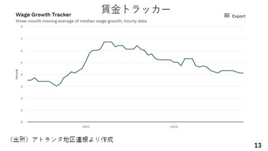 次に労働市場をみてみましょう。はじめに、アトランタ地区連銀公表の賃金トラッカーです。賃金の伸びの縮小が続きましたが、ここにきてそのペースに歯止めがかかりつつあります(スライド13)。