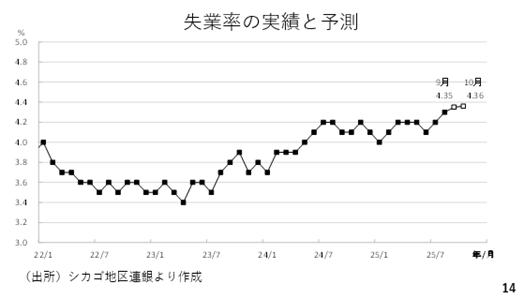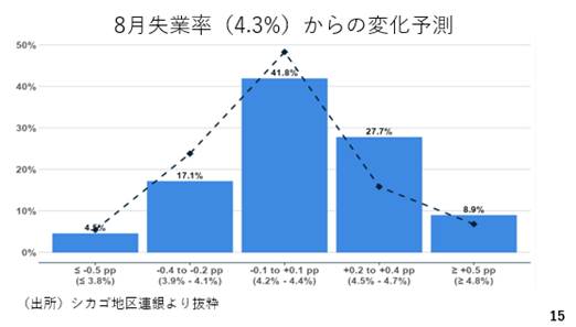 また、シカゴ地区連銀の失業率の予測も、8月の失業率4.3%に対し、9月、10月はそれぞれ4.35%、4.36%と概ね横ばいです。賃金トラッカーと合わせ、労働市場の悪化に歯止めがかかりつつあるように見受けられます(スライド14)。