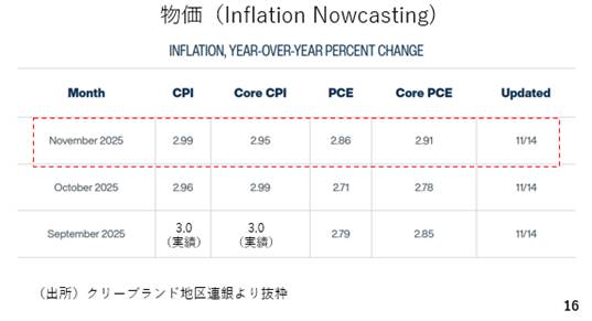 もっとも、クリーブランド地区連銀が公表しているインフレーションナウキャスティングによれば11月はCPI、PCEともに水準は高く、10月からわずかに上昇しています。この辺りが先にみたFRB高官らの発言につながったと考えられます(スライド16)。
