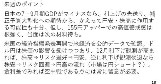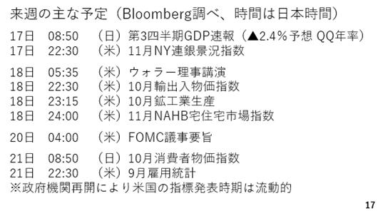 では来週の予定をみておきましょう。米国の雇用統計の発表が予定されていますが、政府機関再開からまだ間もない為、実際に発表されるか流動的です。この為、来週は日本の第3四半期のGDPに注目です。現在、マイナス成長が見込まれています(スライド17)。