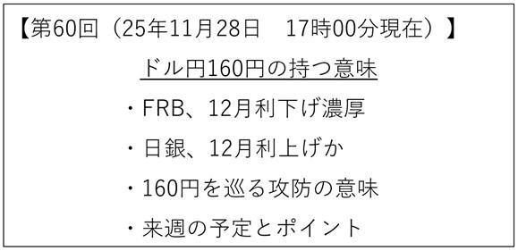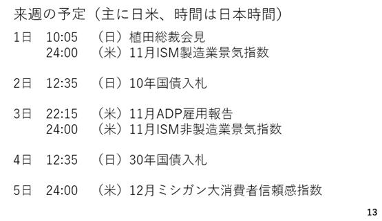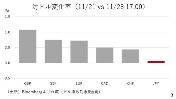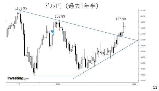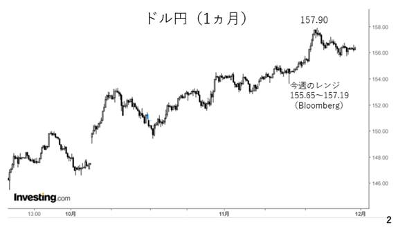 ドル円は、高市総裁が選出されてから上昇し、先週今年2月以来の高値となる157円90銭まで上昇しました。一方、アメリカの感謝祭を含む今週は総じて小動きでしたが、ややドルが軟調に推移しました(スライド2)。