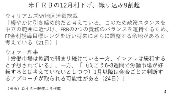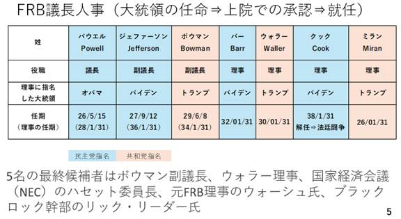 尚、現在は辛うじて民主党大統領によって指名された理事が過半数を占めますが、パウエル議長の交代により、これが逆転します。ただ、誰がFRB議長に決まっても、あくまでデータを重視して政策を判断するはずで、大統領に忖度して無理に利下げを続けることはないでしょう。理事の後のキャリアに響くからです(スライド5)。